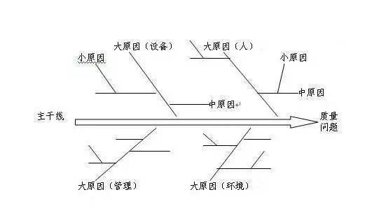 ③ 画出干线主骨、中骨、小骨及确定重大原因(一般从5M1E即人Man、机Machine、料Material、法Method、测Measure、环Environment六个方面全面找出原因);