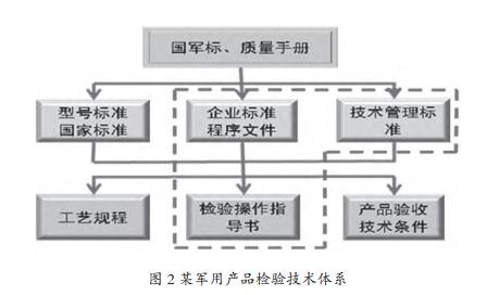 检验对于产品而言,是对产品的一个或多个质量特性进行的诸如观察、测定或试验、度量,并将同规定要求进行比较以确定合格与否的活动。它需要充分运用各种检测方法去证实所加工的产品质量特性符合技术文件要求即文实相符,而这种证实数据的获取技术即为检验技术。产品质量特性的获取不是单一检验方法和技术能够满足的,它需要最大限度地整合各种检测手段和技术,才能保证产品质量特性全部获取,这就是体系的作用,如图2所示是某军用产品检验技术体系,各处单元相互关联、相互支持,检验体系通过诸如基础管理、目视检验、尺寸测量、装配检验等检验技术内容有机融为整体,形成合力,才能发挥检验把关职能。