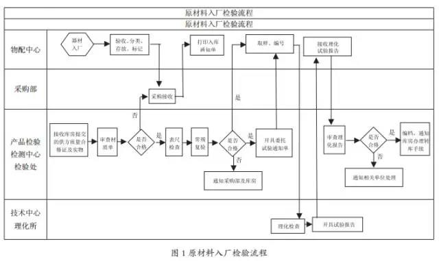 流程(Process),也译为过程,是“工作流转的过程”的简称。这些工作需要多个部门、多个岗位的参与和配合,这些部门、岗位之间会有工作的承接、流转,因此流程也可以说是“跨部门、跨岗位工作的过程”。流程本身是业务动作的载体,它是现代企业管理研究的重点内容之一,如图1所示为某企业原材料入厂检验流程,此业务流程4个不同职能部门,部门之间有分工有协作,按此流程图可有效完成原材料入厂检验工作。但并不是企业的所有业务工作都是有流程图作指导的,各部门是根据各自的职责分工完成相应工作,当某项工作内容在流程中职责分工不明确时,会使整个流程中断或无法实现业务增值的目的,这就会产生质量风险。