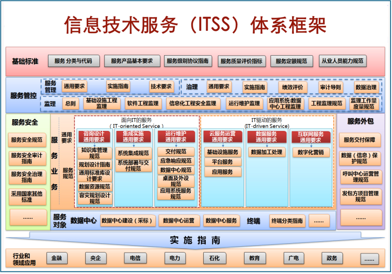 ITSS3.1体系的提出主要从产业发展、服务管控、业务形态、实现方式和行业应用等几个方面考虑,分为基础标准、服务管控标准、服务外包标准、业务标准、安全标准、行业应用标准6大类。