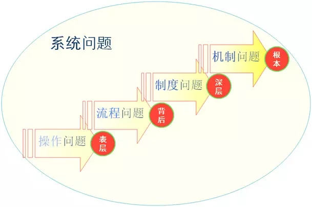 针对操作性问题,找流程本身的问题。如果解决了责任和方法,但仍然解决不了问题的重复发生,那可能就是制度问题了。而制度问题往往与机制设计相关,到这个层次基本上就能够判断企业的系统风险管理水平了。