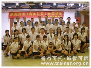 2009年9月19日,誉杰公司受其人力资源部委托,为其行政办公人员举办了为期一天的《商务礼仪》培训。培训内容涉及“形象塑造、商务交往、办公、宴会、参观、会务”等全方位礼仪,为康美药业股份有限公司尽现“康美”之美增光添彩。
