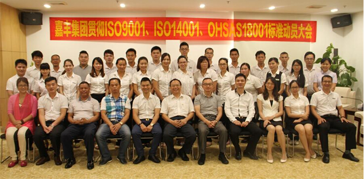 2015年7月31日,嘉丰集团全体骨干员工在集团总部召开ISO三标管理体系动员大会,标志着嘉丰集团公司ISO9001/ISO14001/OHSAS18001(下文简称ISO三标)管理体系认证及实施导入项目正式启动。