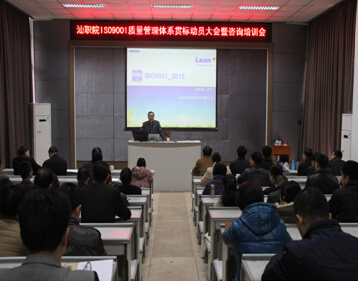 贯标动员大会结束后,随即进行了为期一天的、由广州誉杰管理咨询有限公司代表肖宁咨询师主讲的有关ISO9001基础知识的专题培训。讲座中,肖老师结合ISO9001质量管理体系版本的演变,重点介绍了ISO9001族的基础概念、质量理念、质量原则,以及管理优势,全面展现了国际质量管理体系ISO强大优势,为接下来的持续培训与辅导奠定了基础。
