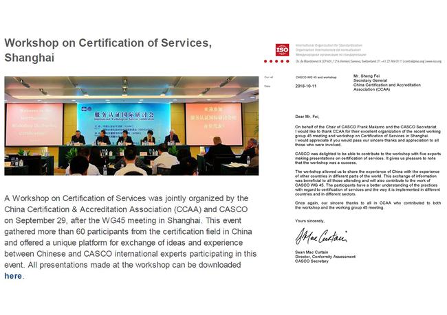 日前,国际标准化组织合格评定委员会(ISO/CASCO)官方媒体《新闻通讯》(Newsletter)对中国认证认可协会和ISO/CASCO联合举办的服务认证国际研讨会进行了专题报道并高度肯定,称之为“分享中国理念和经验的杰出平台”。这是ISO/CASCO首次对我国举办的认证认可活动进行专门报道。同时,ISO/CASCO向中国认证认可协会秘书长生飞专门发来感谢信,对中国认证认可协会在上海召开的第45工作组(WG45)会议和服务认证国际研讨会中所提供的出色会议组织工作表示感谢。ISO/CASCO表示,中国认证认可协会组织的服务认证国际研讨会分享了中国理念和经验,为世界各国专家经验交流创造了机会,不仅使参会人员受益,也为ISO/CASCO/WG45工作组(服务认证方案示例和指南)做出了实质贡献。 中国认证认可协会此次借助承办ISO/CASCO/WG45工作组第三次会议的有利时机,联合ISO/CASCO于2016年9月29日在上海共同举办了服务认证国际研讨会。通过国际研讨会在国内举办的天时地利,中国认证认可协会组织我国服务认证领域专家与ISO/CASCO/WG45国际工作组专家进行了深入沟通和充分交流。ISO/CASCO/WG45第三次工作组会议有7名我国专家作为成员或观察员参会,服务认证国际研讨会有3名我国专家做专题演讲,人数与以往相比具有较大突破,不但在国际层面全面介绍了协会承担的国家“十三五”重点研发计划NQI专项中《服务认证关键技术研究与应用》项目的研究框架和路线,也介绍了我国服务认证前期研究的初步成果和工作实践,还实质参与了ISO/IEC 17029《服务认证方案指南与示例》国际标准的起草,成功将我国服务认证先进理念和经验写入了国际标准,为服务认证国际标准的制定做出了不可或缺的贡献,实现了我国在合格评定国际标准制修订方面从参与到引领的跨越。 |
