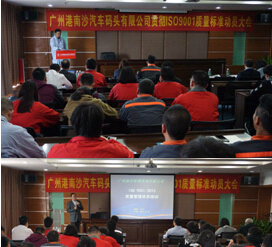 广州港南沙汽车码头有限公司召开导入ISO9001质量管理体系动员大会,标志着广州港南沙汽车码头有限公司全面导入质量管理体系工作正式启动。公司总经理梁敬出席会议并作动员讲话,公司副总经理金光、各部门主要负责人及专职人员参加会议。,广州誉杰管理咨询有限公司高级咨询师肖宁受邀到会指导工作。