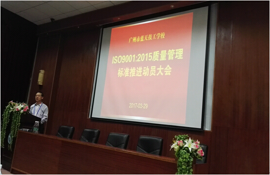 广州市蓝天技工学校召开ISO9001:2015质量管理体系动员会,会议由罗荣禄校长、丁海洋副校长、贯标工作推进委员会和质量管理员队伍,以及广州誉杰咨询管理有限公司咨询师吴清飞等出席会议。会上罗荣禄校长对学校建立ISO9001:2015质量管理体的目的、意义和要求做出了指示。