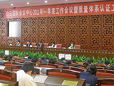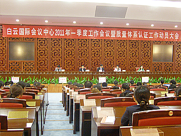 广州白云国际会议中心于2011年4月13日隆重召开了质量体系贯标认证动员大会,广州白云国际会议中心领导及各部门负责人、广州誉杰咨询公司领导及咨询组成员出席了会议。