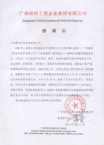 近日,我公司收到了广州纺织工贸企业集团发来的感谢信,对我公司在指导广州纺织工贸企业集团导入ISO9001质量管理体系标准工作中,提供了优质管理咨询服务表示感谢,我公司全体员工深感荣幸,这是对我们工作的最好奖赏。